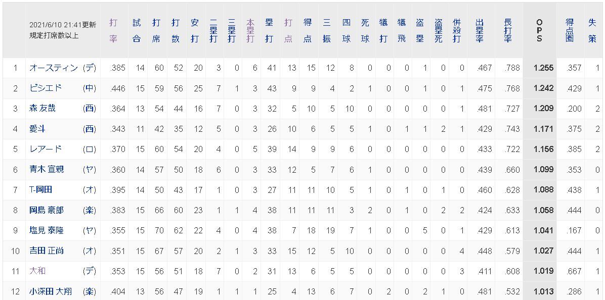 オースティンこのまま残り試合出なくても交流戦MVPもらえる?