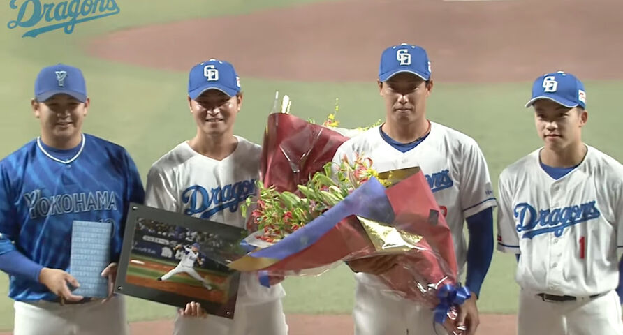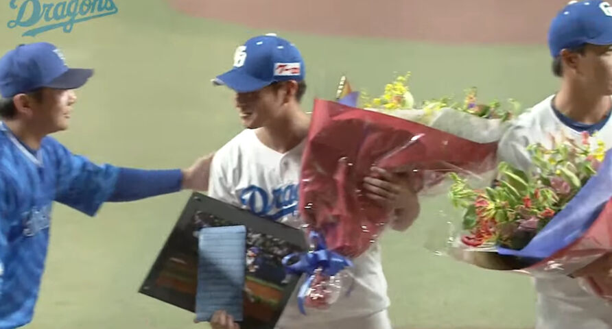 今季限りで現役を引退する中日加藤翔平外野手(33)、砂田毅樹投手(29)の引退セレモニーが試合前に行われた。両軍選手がベンチ前に整列する中で、加藤翔にはチームメート岡林から、砂田にはDeNA山崎から花束が贈呈。さらに家族からも花束が贈られ、ともに笑顔をのぞかせ、中日ベンチ前で立浪監督、選手らと握手を交わした。