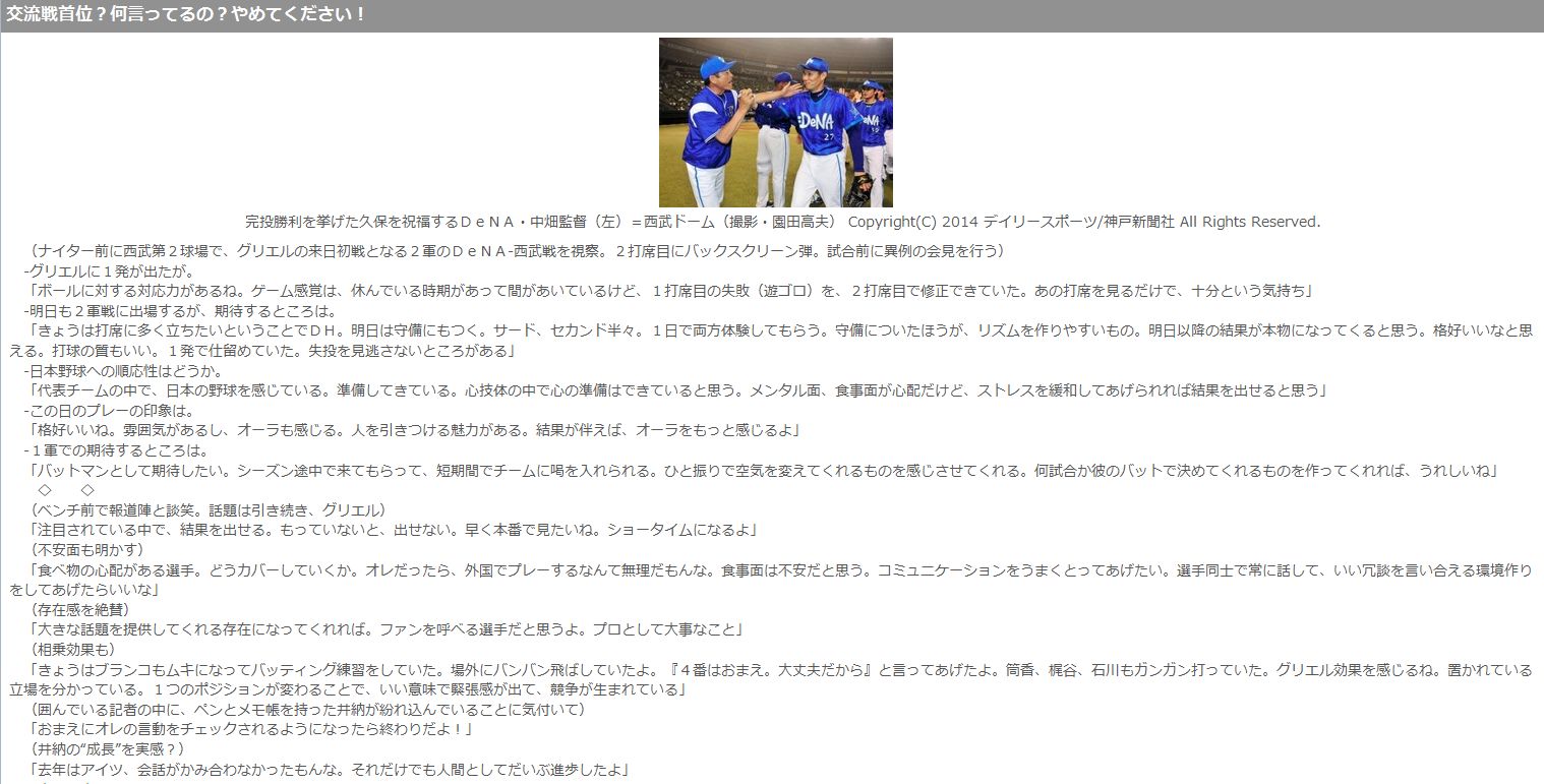 三浦「横浜でもう一回優勝を……」井納「????? ???? ???? ????? ?? ??? ??」三浦「井納?なんだその勝ち星は!?お前、二桁勝ったのか……?」井納「???? ??????? ?? ???? ????」三浦「久保も、モスコーソも……そして山口も先発でこんなに勝ってるのか……?」井納「???????? ??????? ???」三浦「俺がいない間に、みんな頑張っていたんだな……そうか、今の横浜にはたくさんの18番がいるんだな……」井納「でも、やっぱり三浦さんがいないと始まりませんよ」三浦「井納!?お前、いつの間に日本語を……」井納「僕だって成長?????んです。でも、まだ貴?????は遠く及びません」三浦「そうか、そうだな……。まだまだお前達に負けるわけにはいかないな」井納「その意?????すよ、???浦さ????!」